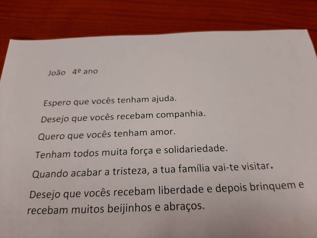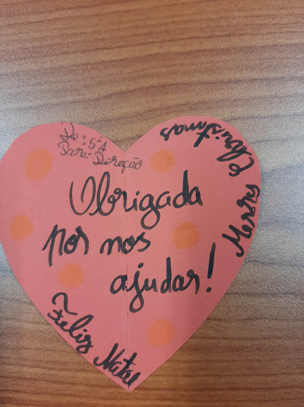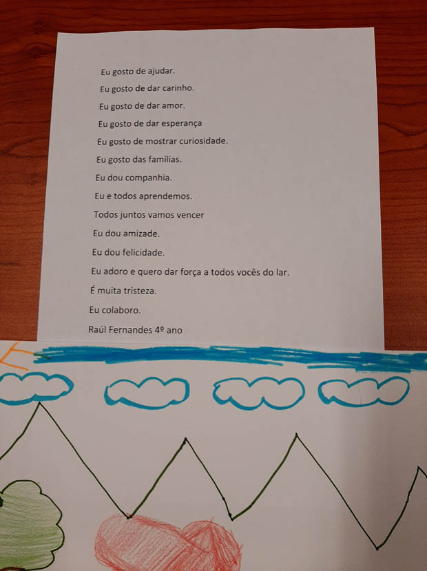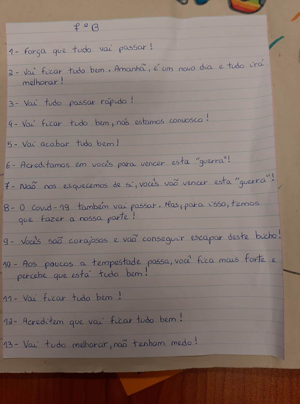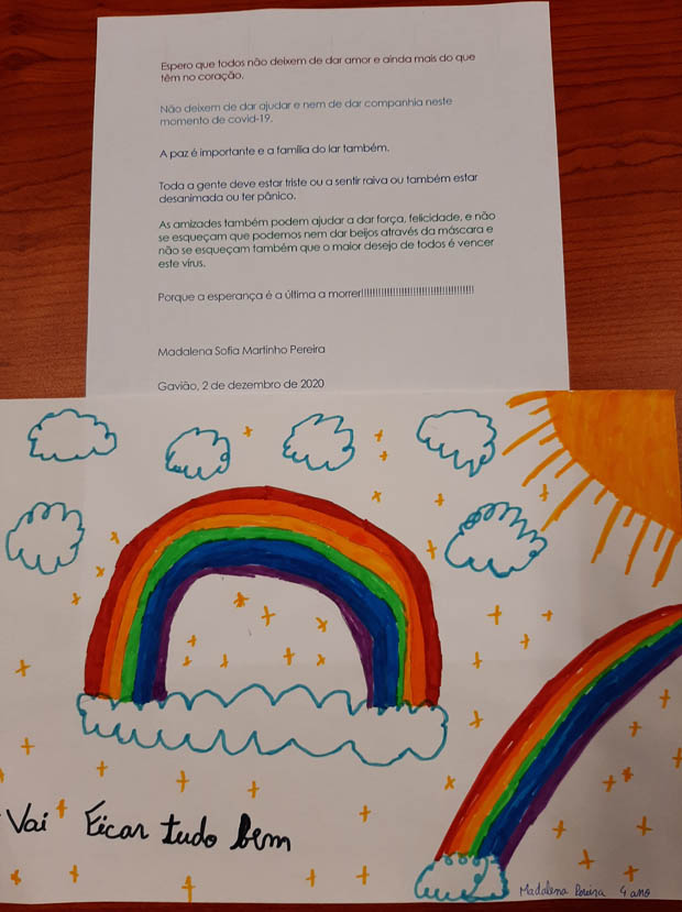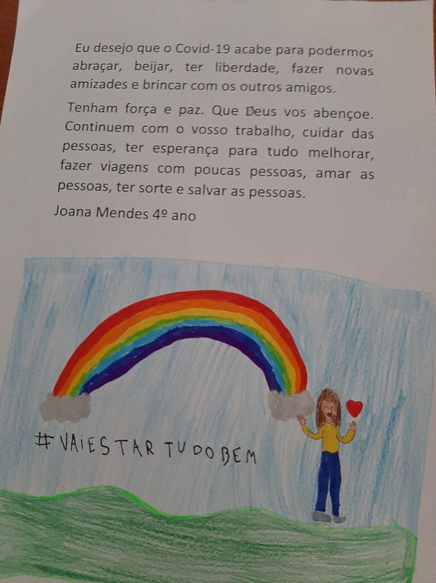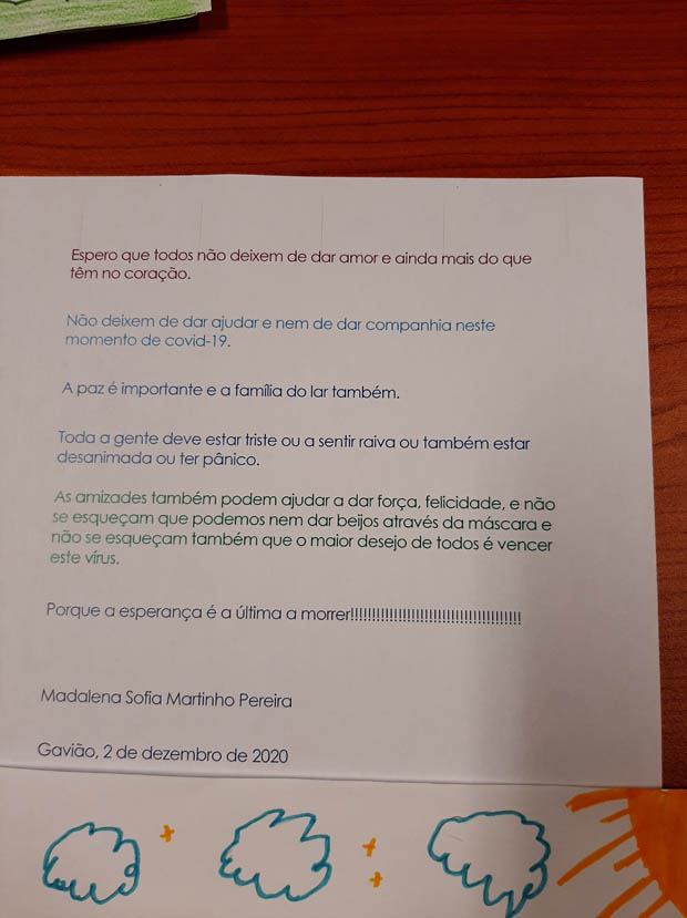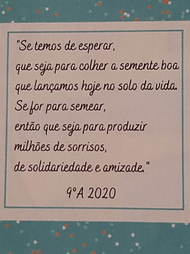 No entanto, os alunos não esqueceram os professores, funcionários e direção reconhecendo o seu trabalho diário, o apoio e carinho que recebem e por zelarem pelo bem-estar de todos. Mas também os alunos não foram esquecidos e receberam mensagens de esperança e gratidão pelo seu esforço diário para estudarem e cumprirem as normas de segurança.