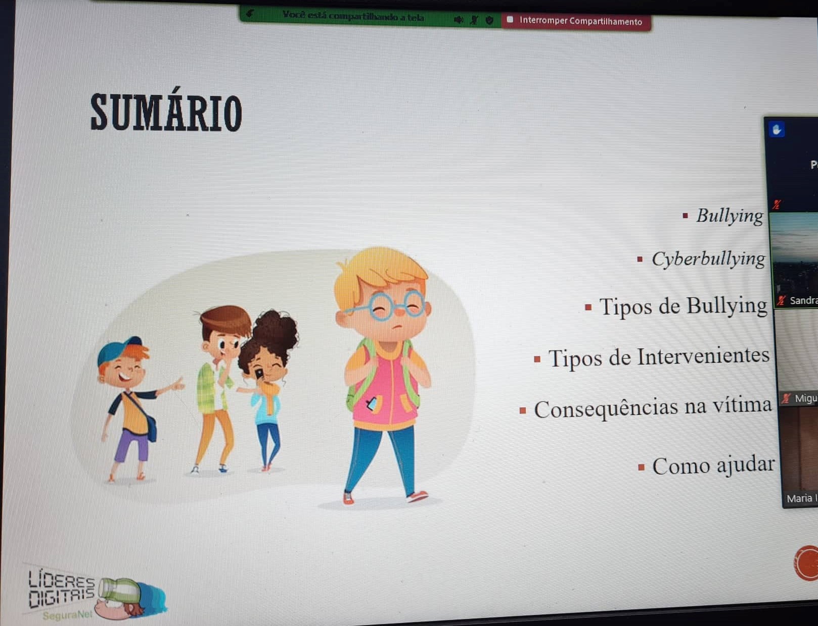 No âmbito das comemorações do dia da Internet Mais Segura 2021, no dia 09 de fevereiro, os alunos Líderes Digitais das turmas do 9º ano, dinamizaram duas palestras online destinadas a alunos e professores dos 2º e 3º ciclos e Ensino Profissional, sobre a promoção de comportamentos seguros e éticos na Internet abordando o tema Bullying/Cyberbullying. Este projeto pretende que os alunos participantes no Projeto Líderes Digitais transmitam aos restantes colegas algumas experiências, mas sobretudo alertem e promovam a utilização segura, ética, esclarecida e crítica das tecnologias digitais.