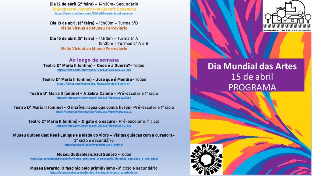 Agrupamento de Escolas de Gavião Dia Mundial das Artes 12/04/2021 Dia Mundial das Artes – 15 de Abril