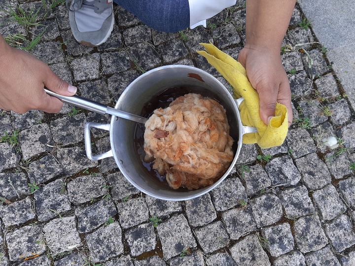 Depois da lavagem ficámos a saber que o processo seguinte é o tingimento. Observámos o tingimento de um pedaço de lã com um corante natural – cascas de cebola – às quais se juntou um pouco de vinagre, que serve para abrir a lã permitindo que fique colorida de forma mais uniforme e um pouco sal que ajuda a fixar a cor. O tingimento consiste em “cozer a lã”, numa panela, em água a ferver e este pedaço de lã ficou, “cor de laranja”.