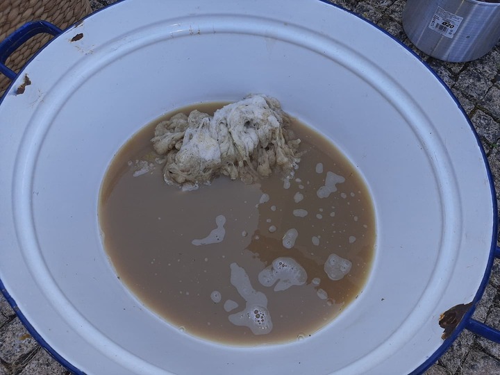 De seguida observámos a lavagem da lã, a qual deve ser realizada com água bem quente, para que lhe seja retirada a sujidade, porque “as ovelhas andam sempre na terra…” e também para que seja retirada a gordura.
