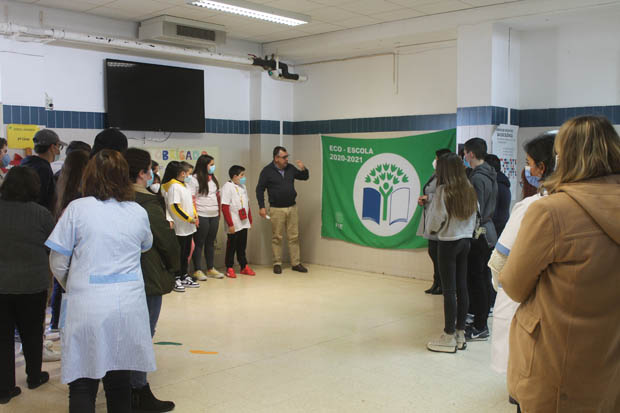 A bandeira foi exposta no átrio principal da escola pelo Sr. Diretor e pela Sra. Vereadora da Educação, na presença dos Delegados Ambientais e de alguns membros do Conselho Eco-Escolas.