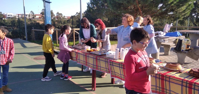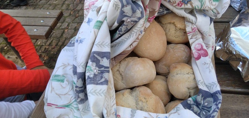 De tarde juntamo-nos no espaço exterior da escola e comemos o nosso pão, os pudins e as castanhas assadas. Soube muito bem comer o que cozinhamos.