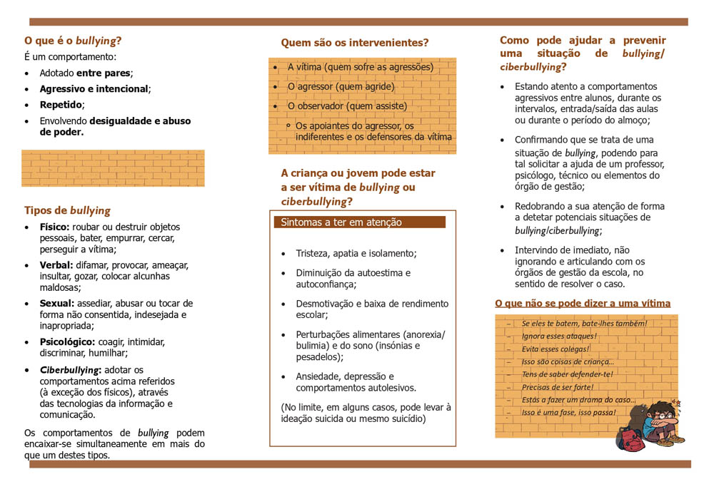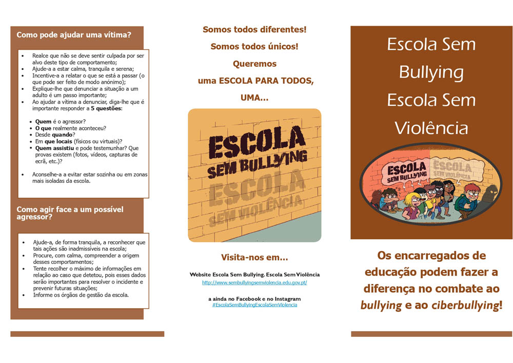 O Agrupamento implementa o Plano “Escola Sem Bullying I Escola Sem Violência” e partilhamos com os pais/encarregados de educação o folheto do Plano com algumas informações e dicas sobre este tema.