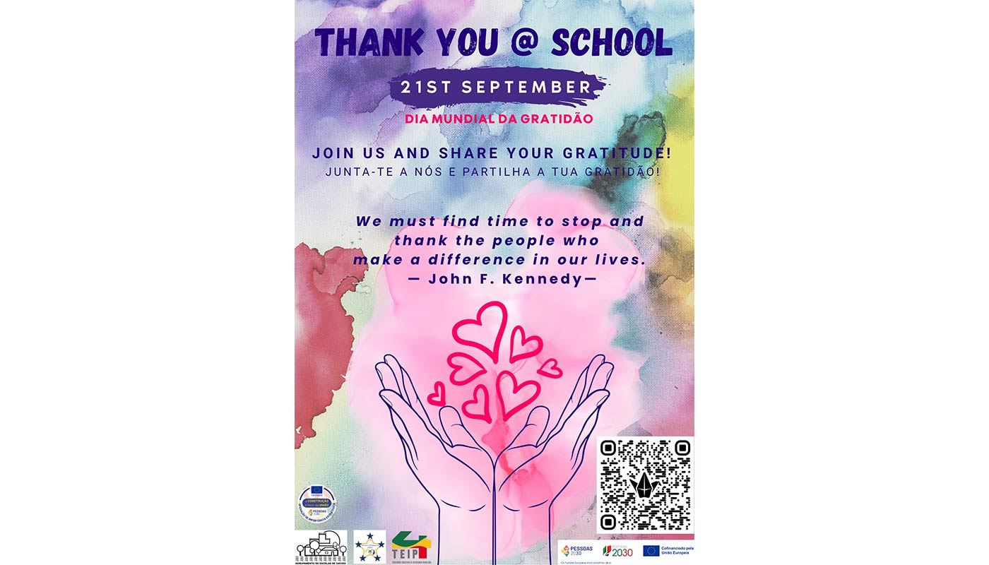 Agora toda a comunidade escolar está convidada a participar! Deixe a sua mensagem de gratidão em qualquer língua através do QR Code do cartaz ou do link: https://padlet.com/silvia_serrano/thank-you-at-school-nz5833patm8txxj4