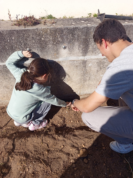 Nesta atividade, os alunos do 1.º ciclo e do ensino secundário trabalham lado a lado, partilhando experiências, saberes e responsabilidades. Enquanto os mais novos descobrem, com curiosidade e entusiasmo, como nascem os alimentos e como cuidar da terra, os alunos mais velhos assumem um papel de orientação, cooperação e exemplo.